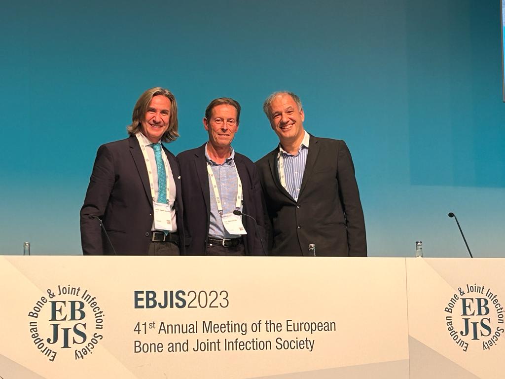 Dr. Aragón-Sánchez, Prof. Senneville y Prof. Uckay durante una mesa redonda sobre infecciones en pie diabético en EBJIS 2023